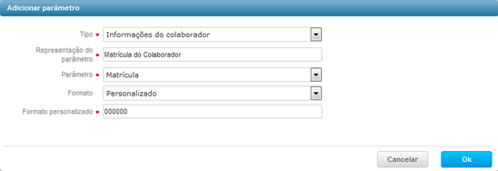 Tipo do Parâmetro - podendo ser Informado pelo usuário, Informações do sistema ou Informações do colaborador.