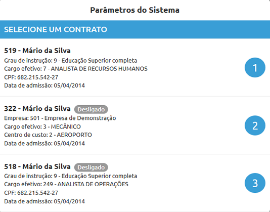 O colaborador Mário da Silva, possui 3 contratos de trabalho, sendo este contratos com empresas diferentes e com funções diferentes. No cadastro do Link, foi informado "Sim" para permitir selecionar contrato. Ao acessar o Portal de Autoatendimento, é possível visualizar as informações dos outros contratos que Mário da Silva, tem.