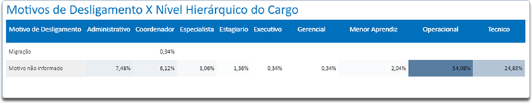 Por meio desse indicador é possível observar o percentual de turnover para cada motivo de desligamento existente. Nesse gráfico, os dados são apresentadas de acordo com o Nível Hierárquico do Cargo. Esses Motivos de Desligamento serão os mesmos apresentados no cadastro de rescisão.
