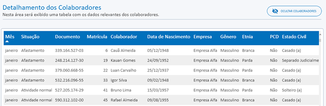 Através do botão Exibe Colaboradores é apresentada a tabela referente ao Detalhamento dos Colaboradores, que permite verificar todos os colaboradores que se enquadram na visibilidade e filtros aplicados, considerando também os itens selecionados para filtros nos próprios gráficos e indicadores desta guia.
