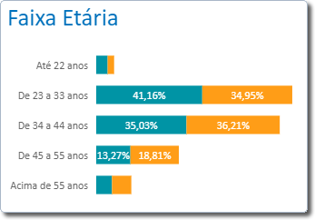O gráfico Turnover x Faixa Etária mostra a porcentagem de colaboradores desligados em relação aos colaboradores ativos no quesito Faixa Etária, sendo as faixas de idade apresentadas de acordo com os intervalos definidos nas Configurações do módulo Integrador.