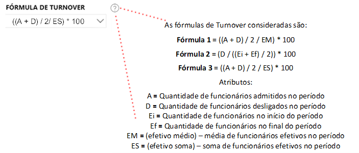 Nesse campo é possível observar a fórmula de turnover que está sendo utilizada e , caso necessário, alterá-la. Clique no ícone Informações caso deseje ver o detalhamento das fórmulas disponíveis para uso.