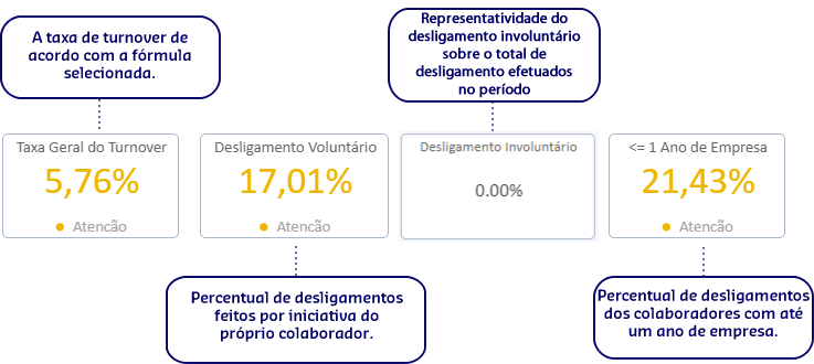 Fazem parte dos Pontos de Atenção os indicadores: Taxa geral do Turnover, Desligamento Voluntário, Alta Performance e Menor ou igual a 1 ano de empresa.