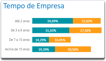 O gráfico Turnover x Tempo de Empresa mostra a porcentagem de colaboradores desligados em relação aos colaboradores ativos no quesito Tempo de Empresa, sendo as faixas de tempo apresentadas de acordo com os intervalos definidos nas Configurações do módulo Integrador.