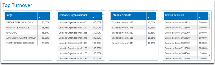 Através deste indicador é possível acompanhar os maiores índices de turnover, que estão organizados por: Cargos, Unidades Organizacionais, Estabelecimentos e Centro de Custos .