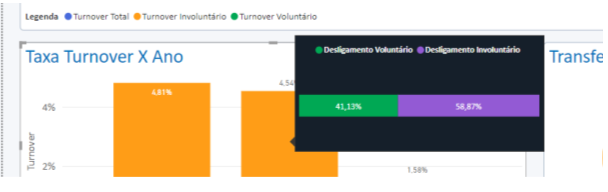 A soma dos percentuais de desligamentos voluntários e desligamentos involuntários devem somar 100% do total de turnover anual.