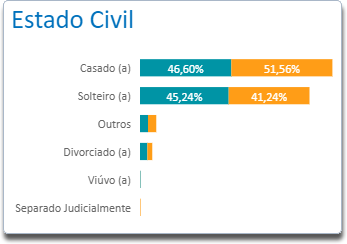 O gráfico Turnover x Estado Civil mostra a porcentagem de colaboradores desligados em relação aos colaboradores ativos no quesito Estado Civil, sendo as faixas de estado civil buscadas no campo Estado Civil da seção Dados Pessoais presente na funcionalidade Ficha do colaborador do módulo Gen.te Recebe - Folha de Pagamento.
