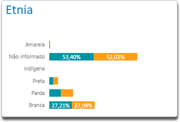 O gráfico Turnover x Etnia mostra a porcentagem de colaboradores desligados em relação aos colaboradores ativos no quesito Etnia, sendo as faixas de etnia buscadas no campo Raça / Cor da seção Dados Pessoais presente na funcionalidade Ficha do colaborador do módulo Gen.te Recebe - Folha de Pagamento.