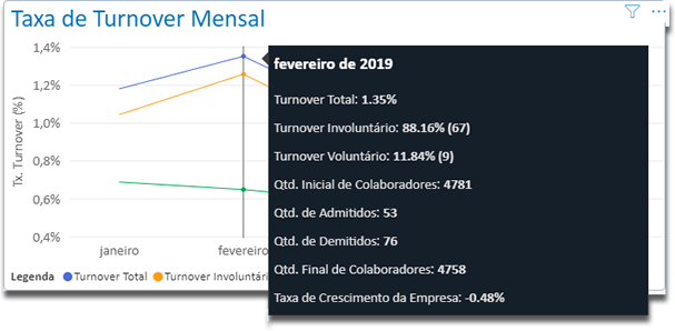 O gráfico Taxa de Turnover Mensal permite ao usuário acompanhar a taxa de turnover dos últimos meses, considerando o mês atual. Nesse gráfico são apresentadas as informações: