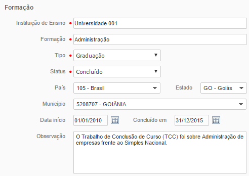 Status - Selecione qual o status de conclusão da formação cadastrada.