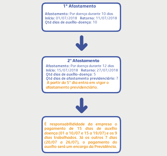 Conforme consta no Decreto nº5.545, de 22 de setembro de 2005, artigo 75 parágrafo 4º, se o segurado empregado, por motivo de doença, afastar-se do trabalho durante quinze dias, retornando à atividade no décimo sexto dia, e se dela voltar a se afastar dentro de sessenta dias desse retorno, em decorrência da mesma doença, fará jus ao auxílio doença a partir da data do novo afastamento.