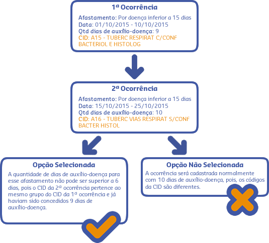 No cálculo dos dias de auxílio-doença o sistema irá verificar a parametrização da opção Afastamento de mesmo motivo, em conjunto com a configuração da opção Gerar dias de auxílio doença para afastamentos que, dentro de 60 dias, não possuem CID informada, na funcionalidade Configurações por Empresa, e só irá considerar o afastamento na contagem quando o indicador Afastamento de mesmo motivo estiver marcado. Caso esse indicador esteja desmarcado, mesmo que o afastamento atenda à configuração de afastamento sem CID, ele não será considerado na contagem dos dias.