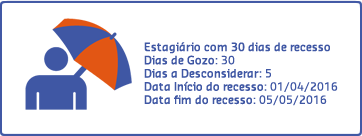 O estagiário João Silva tem direito a 30 dias de recesso, com Data de início em 01/04/2016 , considerando esta data, a Data Fim do recesso é 30/04/2016, porém foi indicado que devem ser desconsiderados 5 dias, desta forma a data fim do recesso é 05/05/2016, pois dentro do período de 30 dias, 5 não serão considerados como recesso.