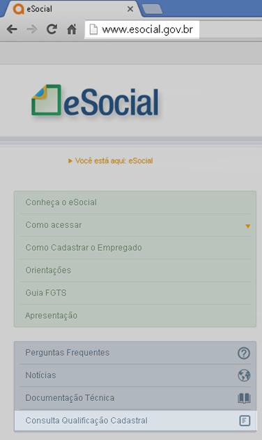 Para realizar a consulta em lote, abra o navegador de internet, acesse o site do Governo www.esocial.gov.br e clique sobre a opção