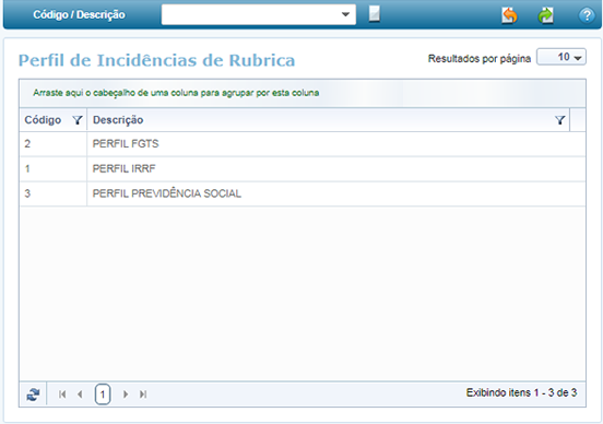 Informe o Código e a Descrição do Perfil de Incidência de Rubrica.