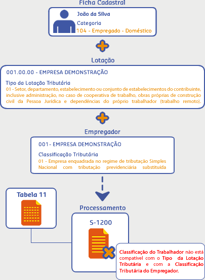 Para os colaboradores que não estiverem compatíveis conforme Tabela 11 - Compatibilidade entre Categoria de Trabalhadores, Classificação Tributária e Tipos de Lotação, ao gerar o arquivo S-1200, será apresentada inconsistência.