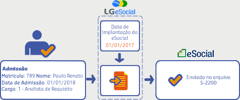 O arquivo gerado como Admissão será aquele em que a data de Admissão do trabalhador é igual ou posterior à Data de Implantação do eSocial parametrizada na funcionalidade Configurações do Módulo.