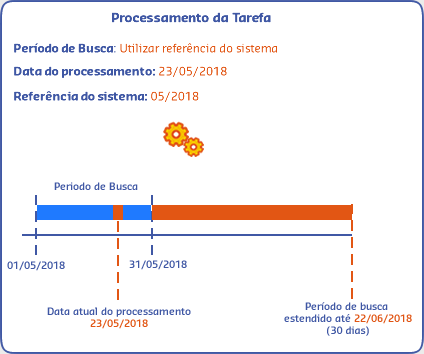 Na funcionalidade Cadastro da Tarefa de Processamento foi informado o Período de Busca: Utilizar referência do sistema, sendo a referência: 05/2018 e a data atual 23/05/2018.