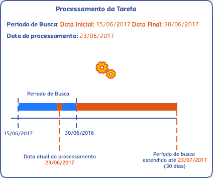 Na funcionalidade Cadastro da Tarefa de Processamento foi informado no Período de Busca com Data Inicial em 15/06/2017 e Data Final: 30/06/2017. A data do processamento é 23/06/2017.
