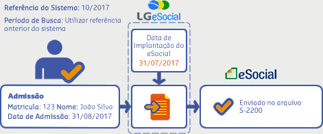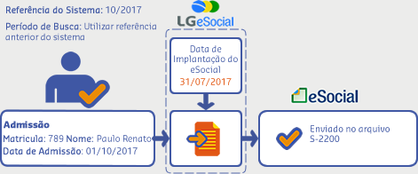 No dia 17/09/2017 o colaborador Pedro Souza foi admitido, sendo o arquivo S-2200 – Cadastro Inicial do Vínculo e Admissão/Ingresso de Trabalhador processado em 27/08/2017. Nesta situação o sistema estava na referência 08/2017.