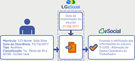 Neste exemplo, a data da ocorrência de Portador de Necessidade Especial não está dentro do período de retificação do arquivo S-2200 – Cadastro Inicial do Vínculo e Admissão/Ingresso de Trabalhador. Em virtude disso, esta alteração será considerada no processamento do arquivo S-2205 - Alteração de Dados Cadastrais do Trabalhador com a data de processamento em 16/10/2017.