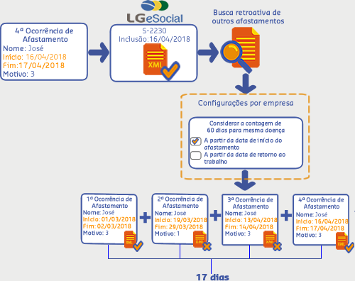 → Na execução da tarefa no dia 16/04/2018, será identificado a 4ª ocorrência com motivo 3, e com a mesma CID ( ou CID do mesmo grupo) e motivo 1 ou 3, como o Afastamento com esse motivo é obrigatório, o arquivo S-2230 será gerado. Posteriormente, será efetuado a busca retroativa de outros afastamentos cadastrados com a mesma CID (ou CID do mesmo grupo) e motivo 1 ou 3, até encontrar a primeira ocorrência de afastamento com mesma CID (ou CID do mesmo grupo) e moivo 1 ou 3 cadastrada. A primeira ocorrência com data em 01/03/2018 e com a mesma CID (ou CID do mesmo grupo) e motivo 1 ou 3 foi encontrada, e existem segunda ocorrência em 19/03/2018, a terceira em 13/04/2018 e a quarta em 16/04/2018 com mesma CID (ou CID do mesmo grupo) e motivo 1 ou 3, como a parametrização está para Considerar 60 dias a partir da data de início do afastamento, será somado a quantidade de dias de afastamento das 4 ocorrências, totalizando assim 17 dias.
