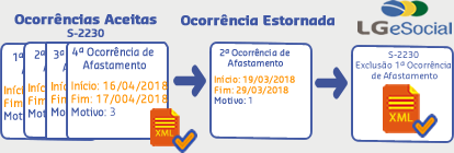 Considerando as mesmas ocorrências do exemplo de inclusão, supondo que após os quatro arquivos gerados tivessem sido aceitos e a 2ª ocorrência fosse estornada, como ela influencia na totalização da quantidade de dias de Afastamento com o mesmo motivo, o arquivo S-2230 de exclusão do 1º afastamento será gerado.