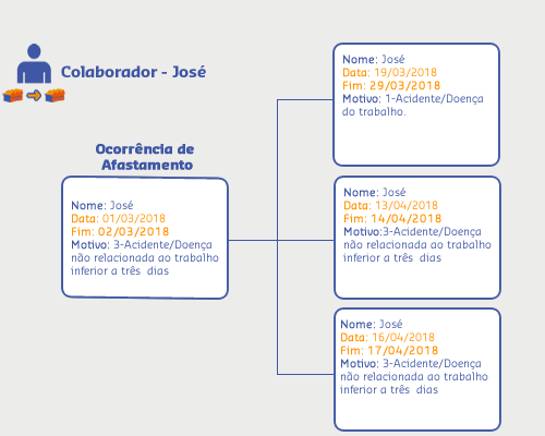 O colaborador José teve seu primeiro afastamento na data 16/10/2018 e logo após, outro afastamento com a data inicial em 01/11/2018.