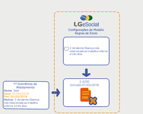 Como a quantidade de dias de afastamento é de dois dias e a regra de envio para afastamentos com motivo 3 está desmarcada, o sistema não gerará o arquivo S-2230 deste afastamento.