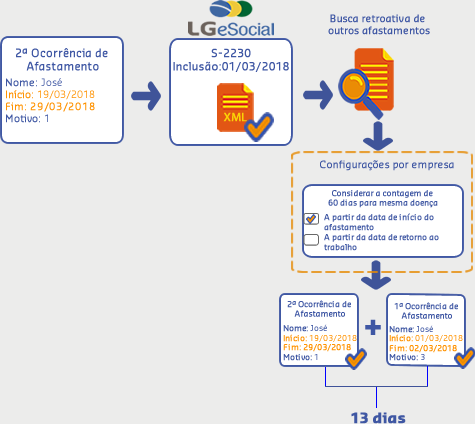 → Na execução da tarefa do dia 19/03/2018, será identificada a 2ª ocorrência com motivo 1 e com a mesma CID (ou CID do mesmo grupo) e motivo 1 ou 3 como afastamento, com esse motivo, é obrigatório gerar o arquivo S-2230 para este afastamento. Após isso, será efetuado a busca retroativa de outros afastamentos cadastrados com a mesma CID (ou CID do mesmo grupo), ou com o mesmo motivo, até encontrar a primeira ocorrência de afastamento com a mesma CID / motivo cadastrada. A primeira ocorrência com data em 01/03/2018 e com a mesma CID e motivo ( 1 ou 3) foi encontrada, e a parametrização está para Considerar 60 dias a partir da data de início do afastamento, será somado a quantidade de dias de Afastamento das 2 ocorrências, totalizando assim 13 dias. Como a soma da quantidade de dias das 2 ocorrências não é superior a 15 dias, o sistema não gera o arquivo S-2230 para o afastamento do dia 01/03/2018.
