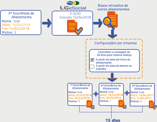 → Na execução da tarefa no dia 13/04/2018, será identificado a 3ª ocorrência com motivo 3 e com a mesma CID (ou CID do mesmo grupo), como o Afastamento com esse motivo é obrigatório, o arquivo S-2230 será gerado. No entanto, será efetuado a busca retroativa de outros afastamentos cadastrados com a mesma CID ( ou CID do mesmo grupo) e motivo 1 ou 3, até encontrar a primeira ocorrência de afastamento com mesma CID (ou CID do mesmo grupo) e motivo 1 ou 3 cadastrada. A primeira ocorrência com data em 01/03/2018 e com a mesma CID ( ou CID do mesmo grupo) e motivo 1 ou 3 foi encontrada, e existem a segunda ocorrência em 19/03/2018 e a terceira em 13/04/2018 com mesma CID ( ou CID do mesmo grupo) e motivo 1 ou 3 como a parametrização está para Considerar 60 dias a partir da data de início do afastamento, o sistema somará a quantidade de dias de afastamento das 3 ocorrências, totalizando a quantidade de 15 dias. Quando o sistema identifica que totalizaram 15 dias de afastamento, mas como não é superior a 15 dias, o sistema não gera o arquivo S-2230 para o afastamento do dia 01/03/2018. Para o segundo afastamento em 19/03/2018, o arquivo também não será gerado, pelo fato de já ter sido gerado anteriormente.