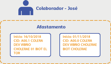 → 1º 01/03/2018 a 02/03/2018 – (2 dias de afastamento);O colaborador José também possui as seguintes ocorrências de afastamento com CID A00.1 COLERA DEV VIBRIO CHOLERAE 01 BIOT EL TOR: