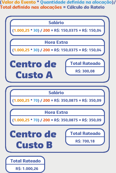 Considerando que a Alocação Principal dos Eventos é o Centro de Custo B, o cálculo será realizado da seguinte forma: