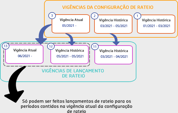 Como observa-se na imagem, as vigências de lançamento 12 e 13 tem período contido dentro da vigência atual 3, enquanto a vigência de lançamento 11 está contida na vigência histórica 2. Dessa maneira, só é possível fazer lançamentos de rateio para as vigências 12 e 13. Para a vigência 11 só serão permitidas operações de consulta, já que ela pertence à uma vigência antiga.
