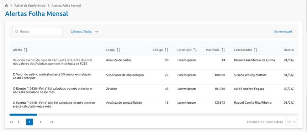 Caso exista algum alerta de cálculo gerado para a folha apresentada no painel de conferência, será disponibilizado o