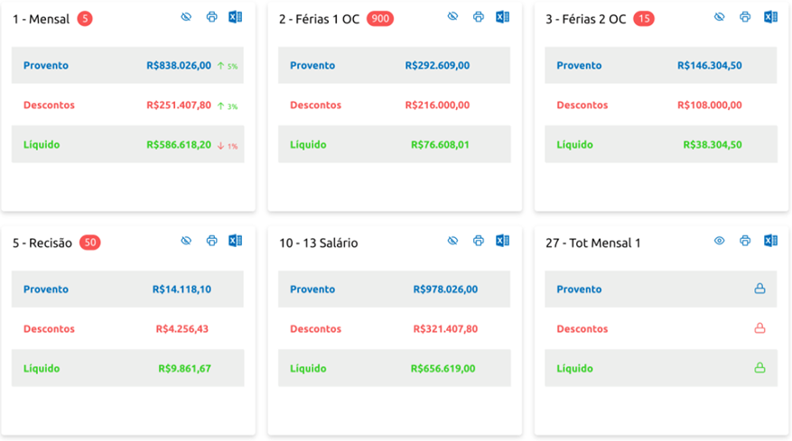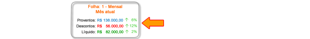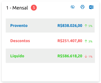 Quando a folha for do tipo mensal e existir valores calculados, ela será considerada no painel de conferência, com os indicadores de variações de valores referente ao Proventos, Descontos e Líquido em relação ao mês anterior. As variações são representadas da seguinte forma: