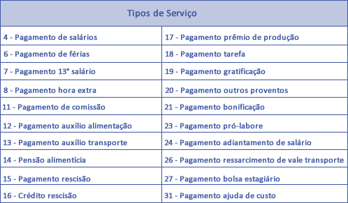 Os Tipos de Serviço disponíveis no leiaute da versão 089 são: