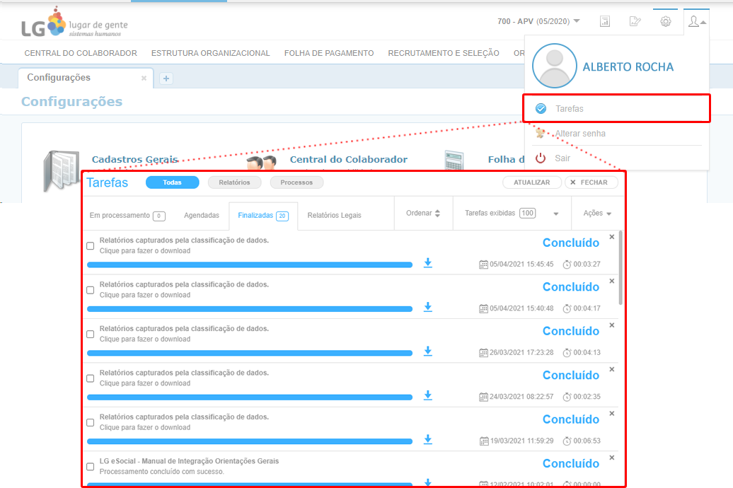 Para conferir os relatórios gerados, acesse a tela Tarefas através do Gerenciador de tarefas