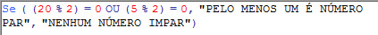 O resultado da função condicional SE é PELO MENOS UM É NÚMERO PAR, o módulo de cinco por dois não é zero, porém o módulo de vinte por dois é igual a zero.