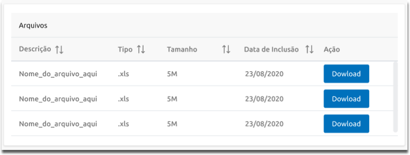 Se durante o cadastro da meta algum arquivo foi anexado ao seu conteúdo, esse arquivo será disponibilizado na seção Arquivos com as seguintes informações: Descrição, Tipo, Tamanho, Data de Inclusão e Ação. É possível baixar o arquivo relacionado à meta, para isso clicando no botão Download.