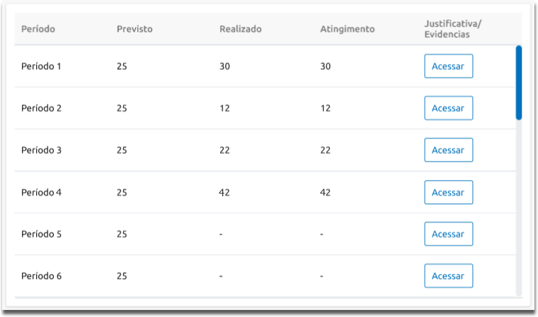 A seção de Informações da Apuração Periódica é representada por uma tabela que exibe os períodos juntamente com os valores Previstos, Realizados e o Atingimento da meta. Para cara período é possível verificar as Justificativas/Evidências através do botão Acessar.