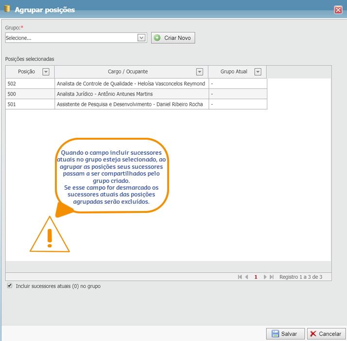 Para que seja possível agrupar posições é necessário selecionar um grupo. Caso nao queira associar as posições selecionadas a um grupo ja existente, clique no botão