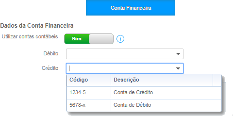 será apresentado nos campos Débito e Crédito listas das Contas Financeiras cadastradas.