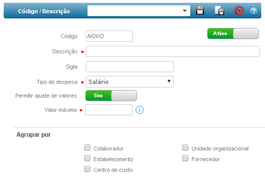Defina informações que identifique um Tipo de Pagamento como Código, Descrição, Sigla e selecione um Tipo de Despesa.