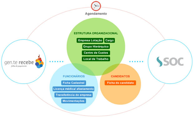 O Integrador cadastra automaticamente diversas informações no SOC. Os dados cadastrados podem ser divididos basicamente em: Estrutura Organizacional, Candidatos, Funcionários, Ocorrências de alteração de estrutura organizacional e Afastamento/Licenças Médicas.