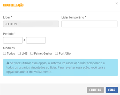 Indique na delegação criada quais Módulos o Líder temporário terá acesso, sendo capaz de possuir acesso à Todos os Módulos, ou apenas à um deles (LMS, PDI, Painel Gestor ou Portifólio).