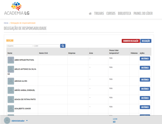 Na tela inicial é listado todos os usuários da plataforma, exceto demitidos. Onde será possível realizar, remover e listar histórico de delegações, através dos botões Delegação, Remover Delegação e Histórico.