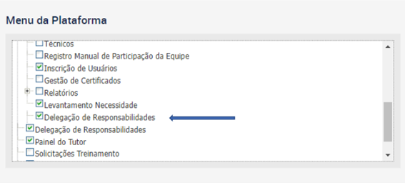 Dentro do Menu da Plataforma, o Administrador da Plataforma deverá marcar a opção Delegação de Responsabilidades, para que assim, apareça para todos que possam ter acesso ao Painel do Líder.
