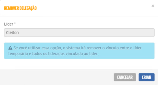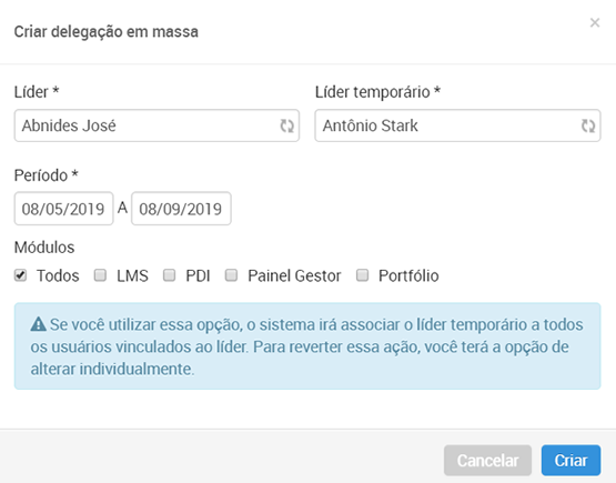 Para Delegação em massa, atribua um Líder temporário para outro Líder, assim sendo, o Líder temporário passará a gerir os usuários subordinados ao Líder que está sendo substituído.