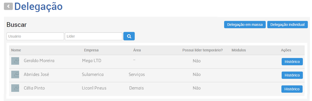 No painel de Delegação são listados todos os Usuários relacionados por Nome, Empresa, Área, se Possui líder temporário e Módulos concedidos à eles.
